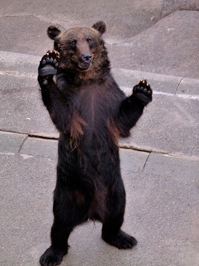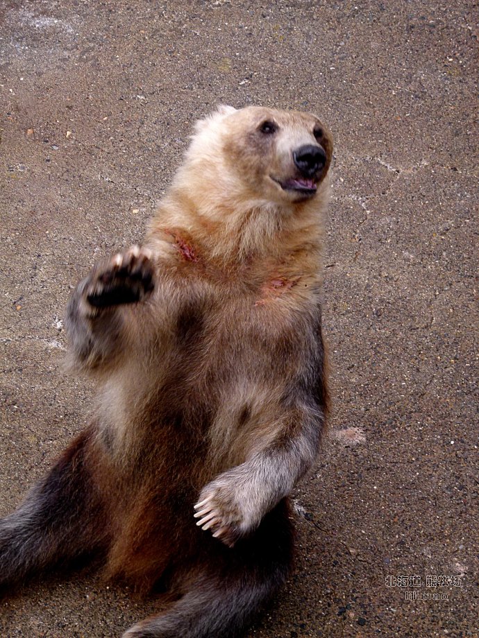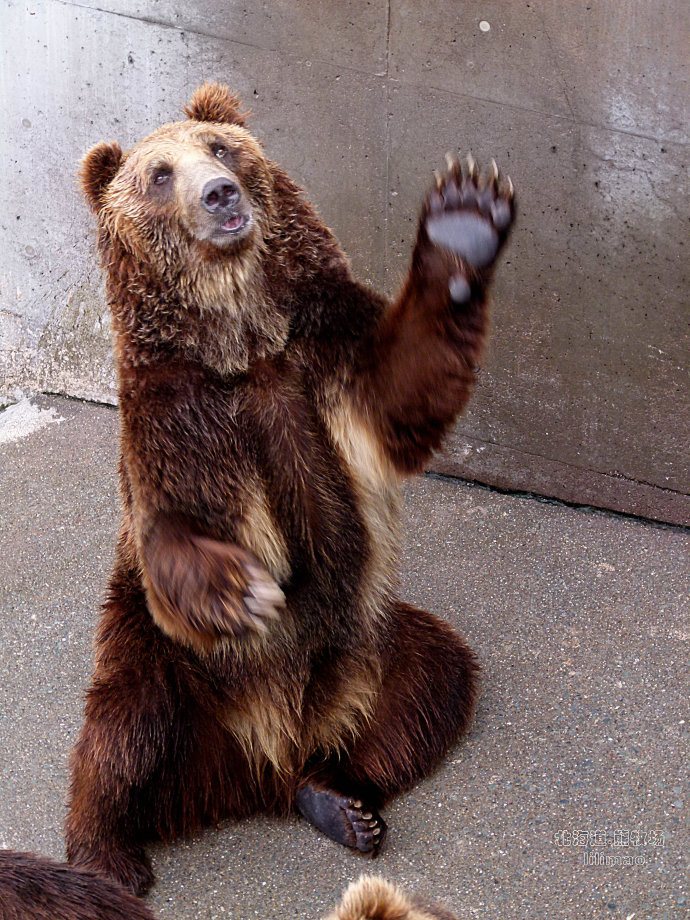 看这只熊站在这里,挥手张望可怜兮兮的样子,好像人的神态,大概已经饿了一天了吧?